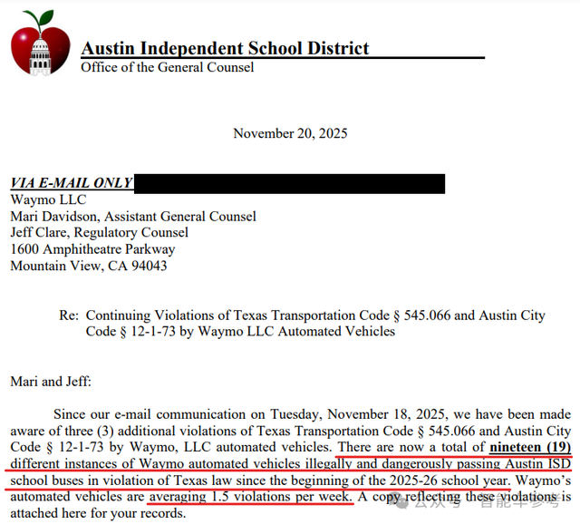 据一份奥斯汀学区报告显示,自新学年开始(今年8月)以来,Waymo的Robotaxi非法超越校车的案例,在当地已达到19次,平均每周违反1.5次。
