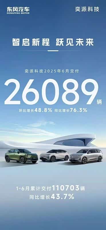 彼时,东风公司上半年仅实现105.51万辆销量,同比下滑约15.8%。东风公司发布的数据显示,6月份,更名后的奕派科技三个品牌(风神、奕派、纳米)销量合计为26089辆,环比增长48.8%,同比增长76.3%。上半年累计为,110703辆,同比增长43.7%。