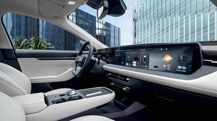 在车内,新款蒙迪欧入门版采用12.3英寸液晶仪表+13.2中控屏的设计;其他款车型均采用12.3英寸液晶仪表+27寸中控的三联屏设计,屏幕长度超过1米,豪华型和至尊型屏幕分辨率为4K。车机系统采用高通骁龙8155芯片,智能语音支持连续对话,双音区设计,可以控制多媒体、空调和天窗等功能。此外,顶配车型前排配有50瓦手机无线充电槽。