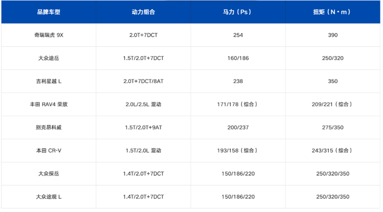 ● 大众途岳/探岳/途观L与吉利星越L主要采用“涡轮增压发动机+双离合变速箱”的组合。大众的1.5T/2.0T+7DCT匹配成熟度极高,换挡逻辑清晰,效率出色;吉利星越L的2.0T发动机动力参数亮眼,部分高配车型也提供了8AT的选择。