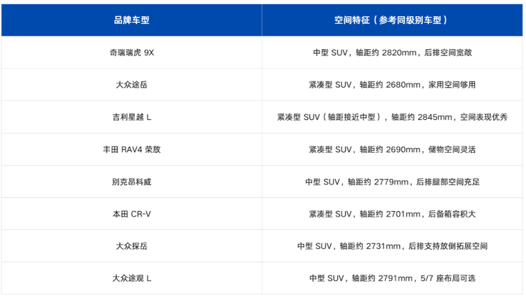 ● 中型阵营(探岳、途观L、星越L、瑞虎9X):轴距的优势带来了更宽敞的后排腿部空间,尤其是途观L和星越L,后排乘客的纵向空间体验已经非常宽裕。