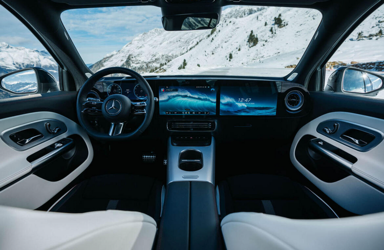 车内设计也有了翻天覆地的变化,可选装的悬浮式MBUX三联屏,贯穿整个仪表台,包括10.25英寸仪表、14英寸中控屏、14英寸副驾屏,加上两侧圆形出风口,十分壮观。