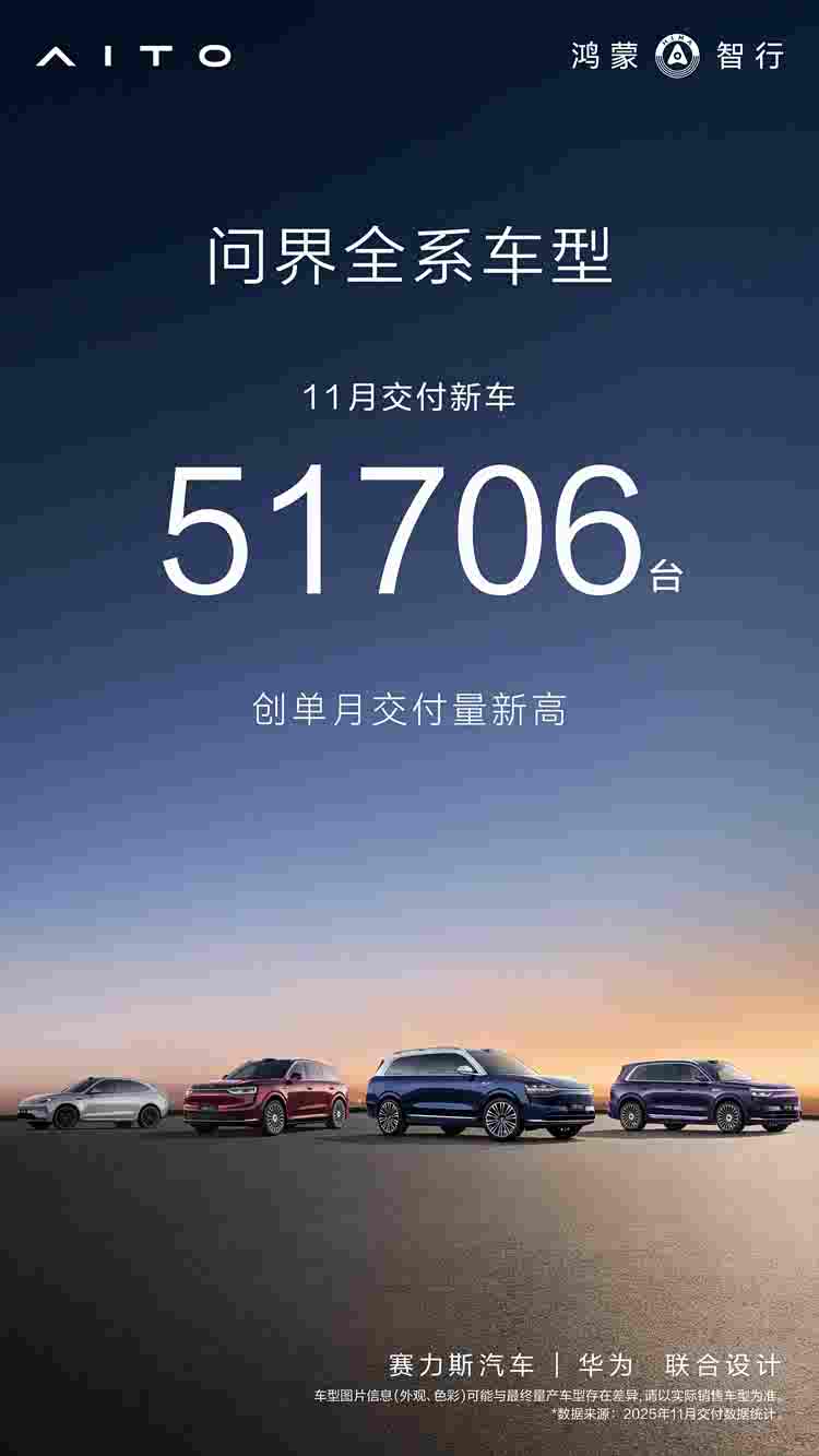 问界品牌经过几年发展,已经成为新能源汽车行业,乃至汽车行业的标杆,大量智能化、电动化技术应用推动品牌高速发展。截至目前,问界品牌累计销量超90万辆。仅11月份,由问界M5、问界M7、问界M8和问界M9等系列车型组成的问界家族,累计销量就达到近5.2万辆,继续领跑豪华车市场。