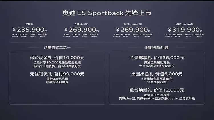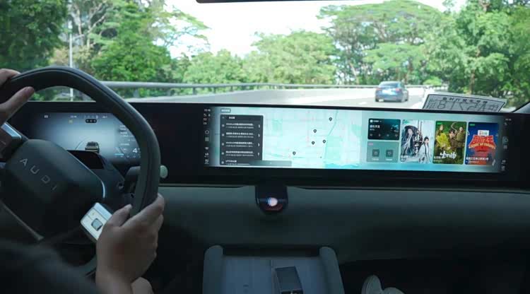 第二款车,也是我试过后挺种草的一款车,上汽奥迪E5Sportback。首先它的外形,是特别正经旅行车的风格,让我这个颜值控外加瓦罐迷毫无抵抗力。而且正如它的“AUDI”全新品牌名一样,这台车内外给人的感觉就是,有奥迪熟悉的质感和科技感,又有很多让人耳目一新的不同之处。另外,它的配置和性能也是当下国内电车旗舰级,787匹马力,3.4秒加速,800V高压平台,1.5米的超宽四联大屏加8295芯片,基本都到顶了。