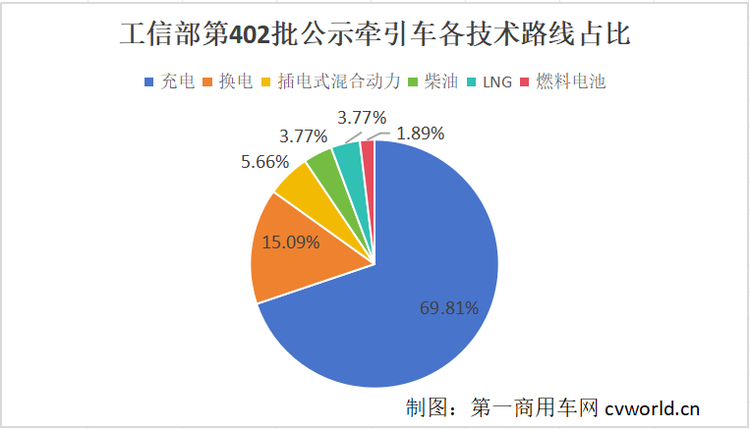 12月5日,工信部发布第402批新车申报公示,牵引车方面有53款申报在榜,居年内最高。其中,新能源牵引车49款,包括充电车型37款、换电车型8款、燃料电池车型1款和插电混动车型3款;而主打传统能源的国六牵引车有4款,包括LNG车型和柴油车型各2款。