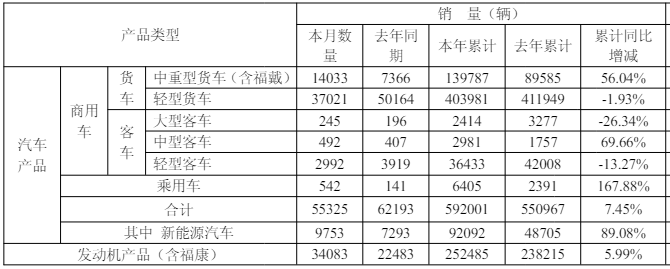 福田汽车11月销车5.5万辆 中重卡暴涨91%