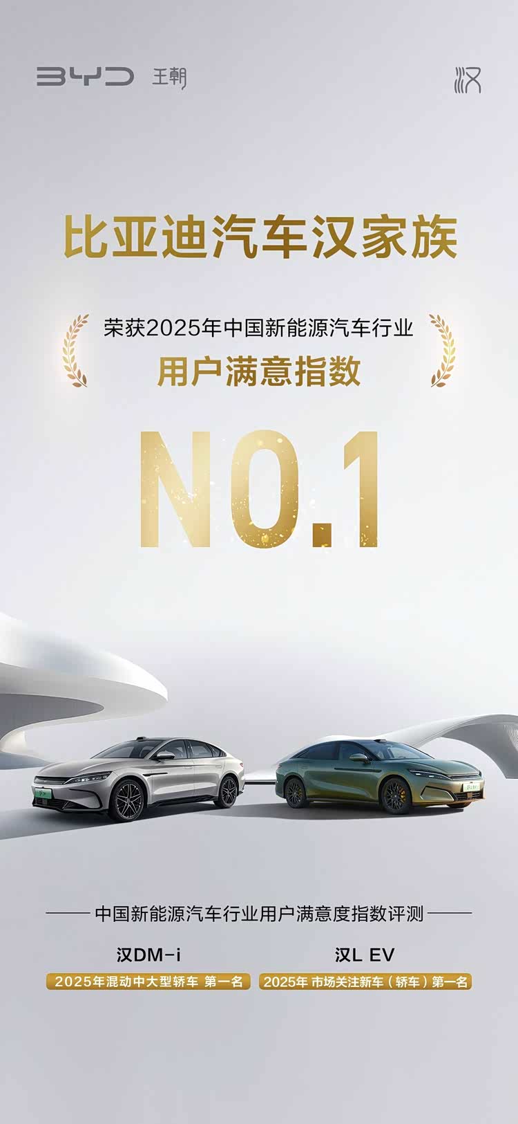 据悉,NEV-CACSI测评已持续开展11年,其测评模型与方法遵循国家标准,因调研范围广、样本量大、维度全面,已成为反映行业产品质量与用户口碑的重要权威依据。本次测评覆盖全国128个城市,收集超2.5万个有效用户反馈,对162款主流车型从总体满意度、质量可靠性、性能设计、售后服务及销售服务五大维度进行了系统评估。此次双车同登榜首,充分体现了权威评测与超百万用户对汉家族产品综合品质与用户体验的高度肯定。