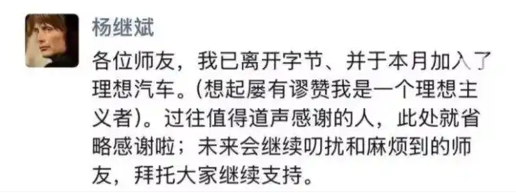 其实早在2025年初,杨继斌就从字节公关部转成了顾问,专注战略咨询,当时就有不少人猜他要挪窝,只是没想到最终选了理想汽车。