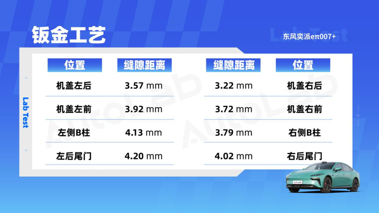 在钣金工艺测量中,东风奕派eπ007+不管是前机盖还是尾门等测量点,左右两侧钣金缝隙误差都比较小,对于这个级别的新能源车型来说,这种工艺表现是让人满意的。
