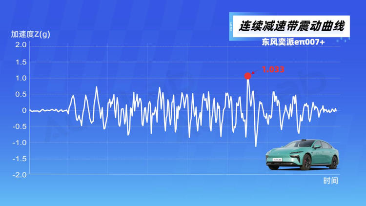 在底盘测试上,我们用专业的传感器读取到东风奕派eπ007+在经过连续减速带组成的颠簸路时,底盘垂向最大加速度为1.033g。