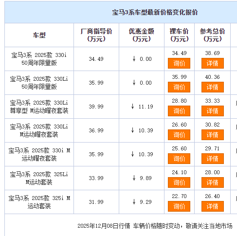 车家号·0浏览·2025-12-08 21:02 · 广东近期车市最劲爆的消息,莫过于 宝马3系(参数|询价)的“价格大跳水”——这款豪华中型车标杆车型终端优惠最高达11.19万,顶配330Li尊享型从39.99万直降至28.8万,部分车型裸车价下探至22万区间,让无数消费者直呼“梦想座驾触手可及”。