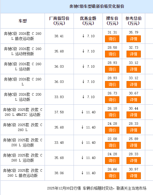车家号·0浏览·2025-12-08 21:03 · 广东豪华B级车市场近期掀起惊涛骇浪, 奔驰C级(参数|询价)以“骨折式”降价引爆热议——终端裸车价最低下探至22.08万,较官方指导价直降超11万,让不少消费者直呼“不敢置信”。这一价格不仅击穿了豪华品牌的传统门槛,更直接与宝马3系等竞品形成正面价格战,网友纷纷感叹“这个预算,还纠结宝马?”