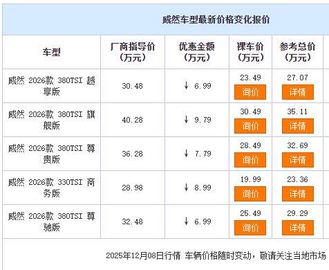 大众威然这波降价够诚意!至高优惠9.79万,老车主酸了