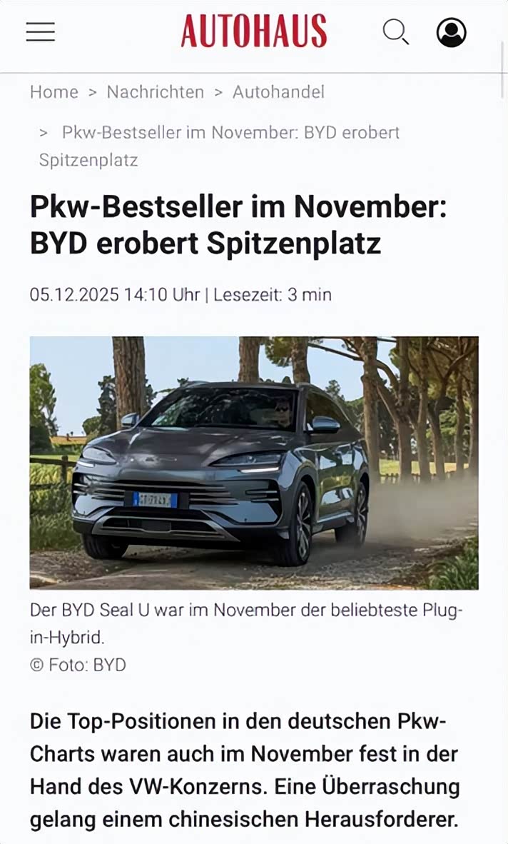 这份“看起来不错”的数据背后,还有一个细节是BYD SEAL U(宋PLUS)成为德国11月车市插混车型销量冠军。