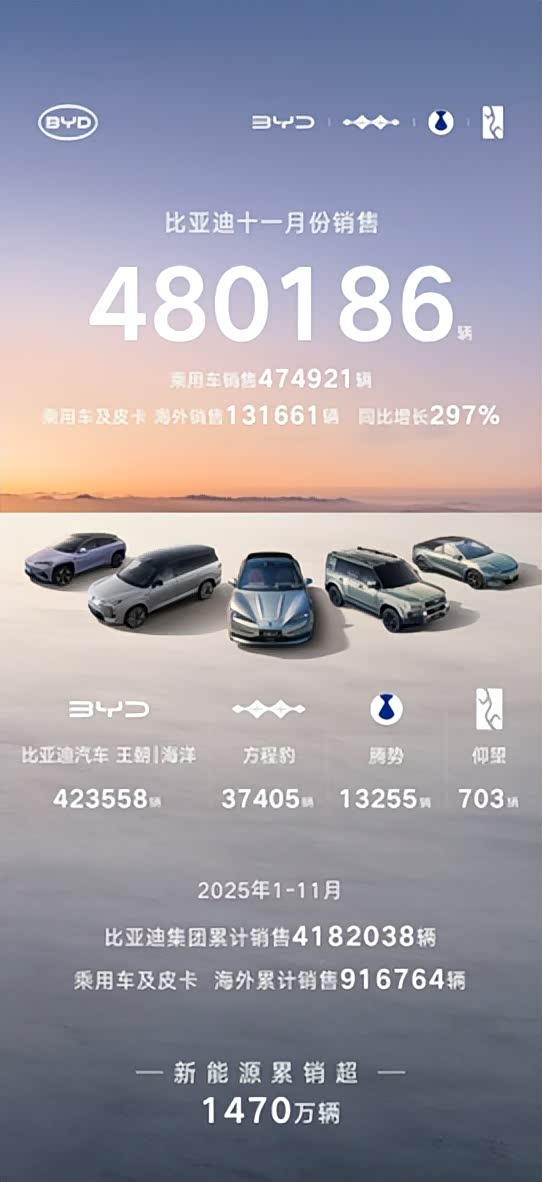 2025年11月的销量数据中,比亚迪有一个非常难得的进步: