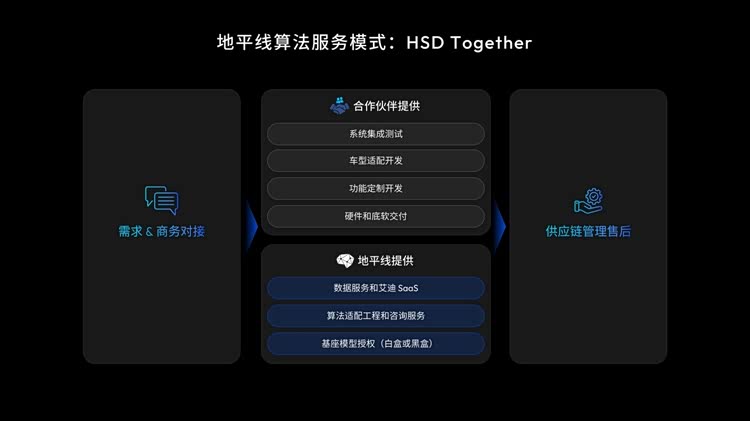 具体展开说,我们跟客户、合作伙伴怎么合作呢?在新的算法服务模式下,首先我们在前面蹚了那么多坑,花了几十亿去训练的这些基座模型,这里面其实也凝聚了地平线算法工程师长期的knowhow,包括我们在工程、软件、硬件等各个方面的集大成者,所以当前至少我不能去吹牛,说我们最好、最好、最好!但不管怎么样,大家现在体验了HSD,都知道这是行业里面最顶级的城区智驾系统,所以这个基座模型是不差的,我们愿意以白盒或者黑盒的方式去授权。