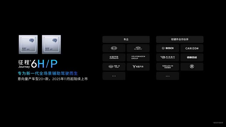 其实,我们在这些年里跟在座各位其实形成了一个非常广泛的,可以说是在中国业态下最广泛的智能驾驶的合作生态。单单只是在发布J6B的这一年时间里面,整个J6 family这一代就已经构建了一个坚实的生态。比如说,我们面向smart camera ADAS、基础ADAS、极致性价比提供的J6B/L,已经与包括国际车企在内,面向全球市场的一系列车企合作。同时我们与博世等合作伙伴的合作,也非常成功。