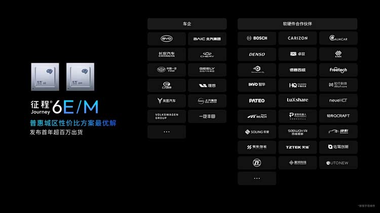 众所周知,我们在中算力J6E/M这一档的芯片,已经成为今年行业里面的爆款,一系列车企都已经成为我们的客户,并且有博世、酷睿程、卓驭、德赛、福瑞泰克等一系列非常广泛的合作伙伴,跟我们紧密地合作在一起。