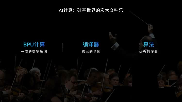 我想打一个形象的比喻,要达成我们追求的这样一个目标,就像是一个硅基世界宏大的交响乐。我们可以把地平线的神经网络处理器BPU,比作一个一流的交响乐团,这里面有丰富的算子,每个算子都非常厉害,但怎么样把它们组合在一起,完成一个整体的软件计算,这里面需要杰出的指挥,指挥就是一个乐团的灵魂,他怎么样把一个非常美妙的乐曲给拆解成每一个算子互相配合的行为,最后呈现出无与伦比的艺术作品。