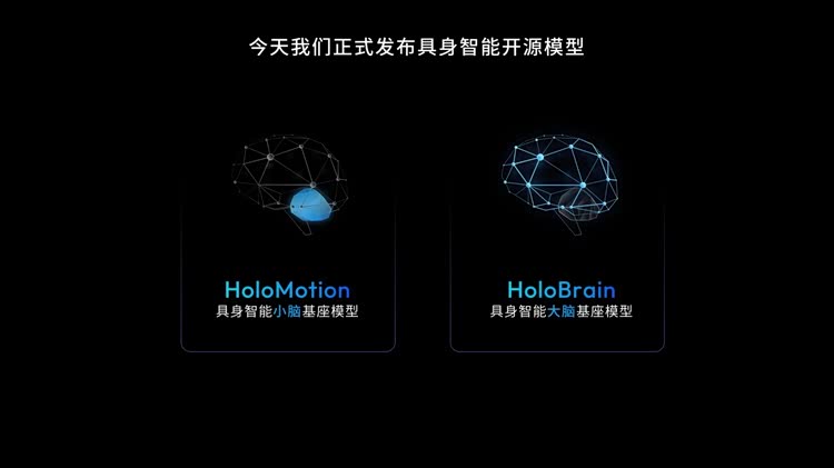 今天我们在这里也正式发布智能开源的、面向机器人的小脑基座模型HoloMotion,和基于具身智能大脑的基座模型HoloBrain。