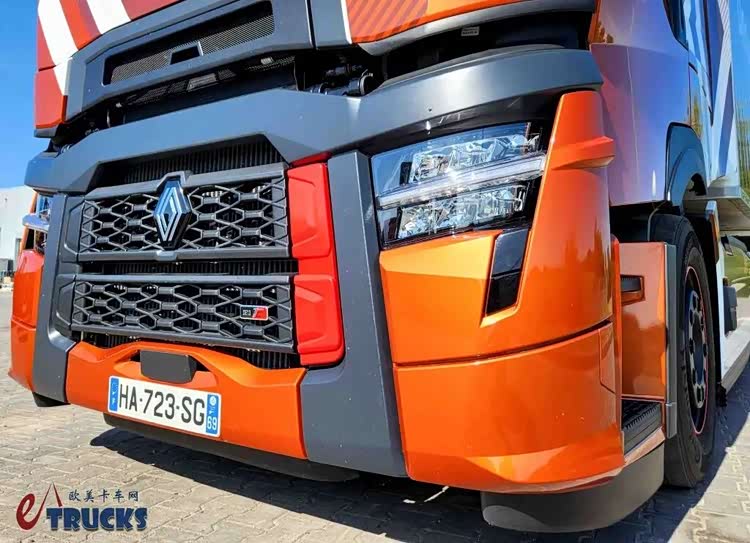 当然,雷诺T-High的造型并非一成不变。在后续改款中,该车换装了全新的LED大灯组。其日间行车灯与转向灯独立突出于灯体表面,在视觉上将大灯划分为上下两层,线条凌厉,科技感十足。大灯侧面还设计有镂空结构,兼具导流功能。结合保险杠下方新增的空气动力学饰件,整车风阻得到进一步优化,也顺应了当前欧洲卡车行业追求高效低阻的发展趋势。