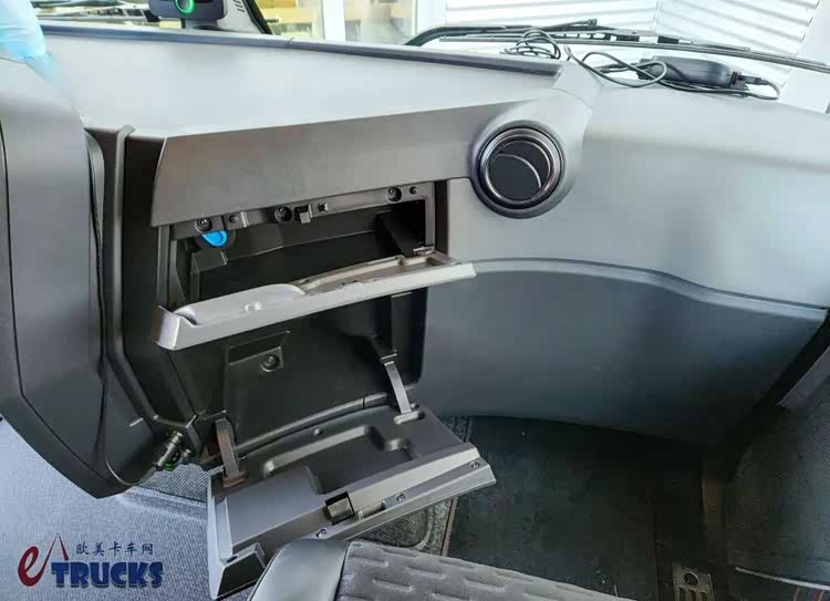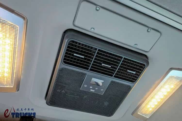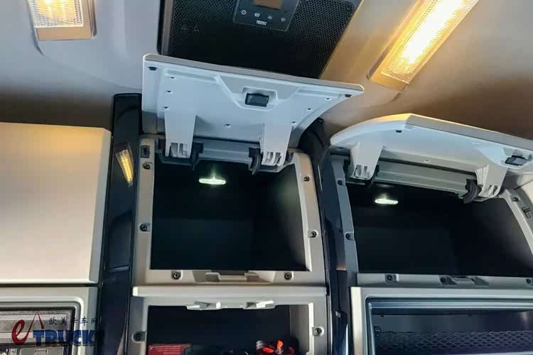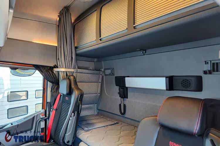 得益于驾驶室的宽敞空间,雷诺T-High在驾驶室顶部设计了三个大尺寸吊柜,总容积高达221升