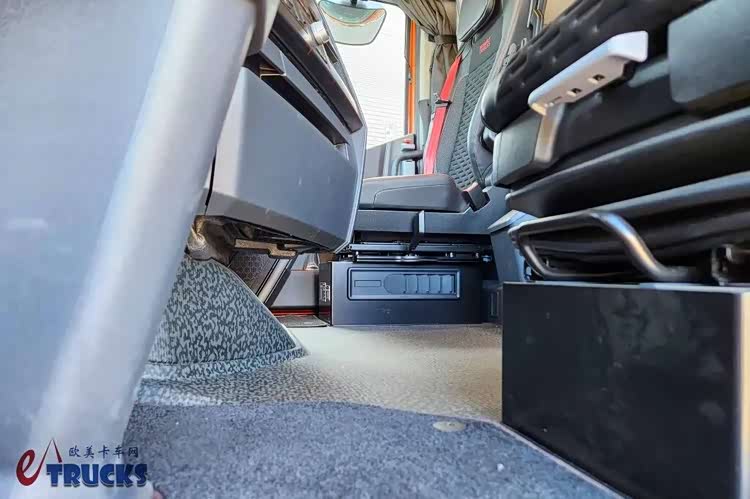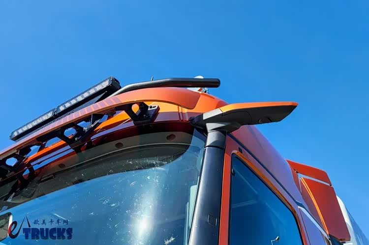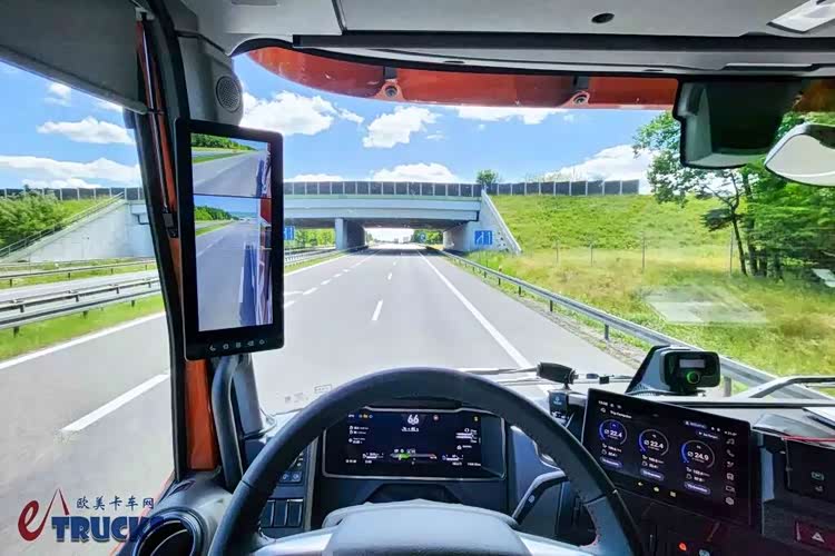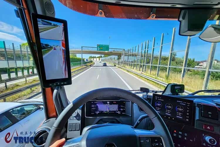 此外,这款雷诺T-High还配备了电子后视镜系统。该电子后视镜与沃尔沃卡车采用的CMS系统同源,融合红外技术,能在雨雪或夜间等低能见度环境下通过红外补光增强显示效果,显著提升视野清晰度与行车安全。相比传统光学后视镜,电子后视镜具有风阻更低、风噪更小、环境适应性更强等多项优势,是现代卡车的发展趋势之一。