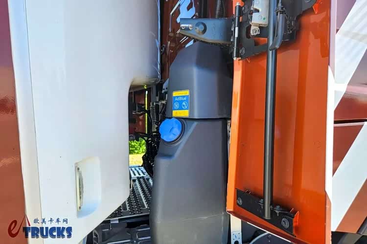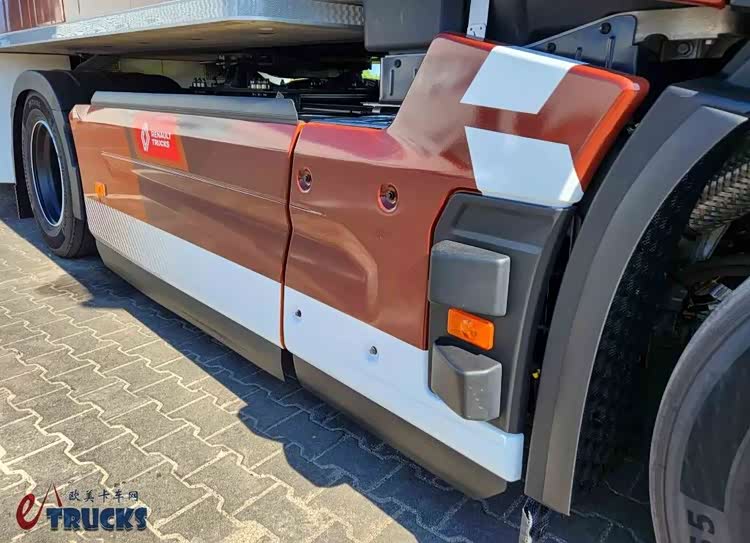 由于底盘空间较为紧凑,雷诺T-High Smart Racer便将尿素液罐放到了驾驶室后方。其罐体采用异形设计,规避了挂车前端活动区域,不会和挂车发生碰撞。