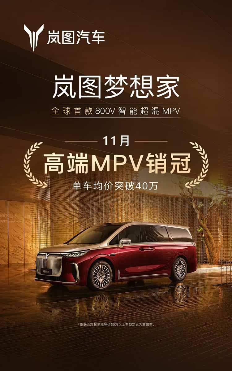 2025年11月高端MPV销量数据出炉, 岚图梦想家(参数|询价)以9027台的成绩,再次蝉联高端MPV市场月销冠军。