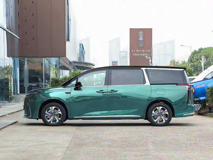 车身侧面是标准的MPV结构,平直的车顶线条和方正轮廓最大限度地保障了车内空间利用率,隐藏式B/C/D柱设计营造出悬浮式车顶的视觉效果。虽然是一款纯电车型,但它并没有跟风,而是保留了消费者更喜欢的传统式机械门把手。