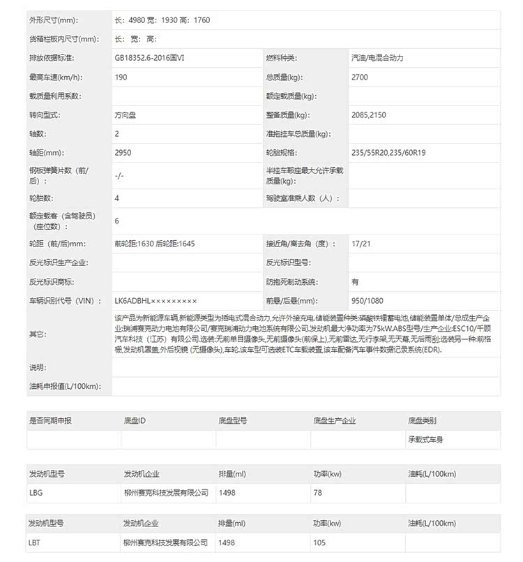 动力部分,从申报信息来看,新车将会搭载由1.5L和1.5T两种发动机组成的插电混动系统,其中1.5L自然吸气发动机最大功率为78千瓦,1.5T发动机最大功率105千瓦,匹配的是磷酸铁锂动力电池组。