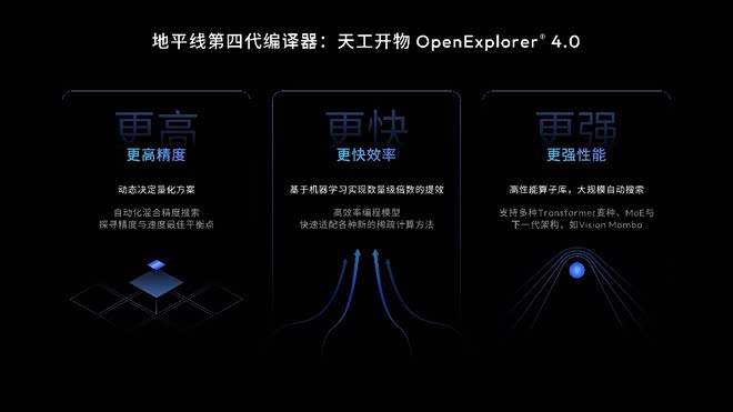 此外,本次发布的第四代编译器天工开物OpenExplorer®4.0,实现了更高精度、更快效率和更强性能的突破,编译速度从小时级提升至分钟级,模型性能提升20%。其革命性在于引入了AI驱动的优化策略,标志着编译器技术从工具自动化,迈向了基于机器学习的自我进化新时代。