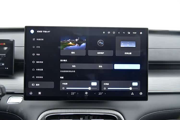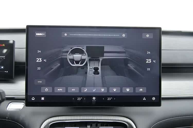 内饰要比老款更接近新能源车,放弃了奔驰那种联屏,而是采用目前更主流的超大屏设计。 方向盘全系都是皮质包裹,支持四向调节,配有多媒体按键,是那种区域微动按键,虽然看上去整体性不错,但高光亮面基本上是“指纹收集器”。
