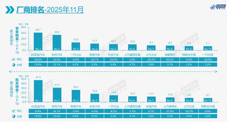日系品牌方面,前十榜单仅有一汽丰田这根“独苗”,11月销量7.1万辆,同比下滑20.9%;广汽丰田当月销量64905辆,同比下滑3.8%。至于本田,表现更为惨淡,11月本田中国销量为50840辆,同比下降33.8%,单月销量跌幅显著扩大,远超此前市场预期。反观东风日产,11月销量64243 辆,同比增长7.9%,成为日系车企中唯一保持上涨的品牌。