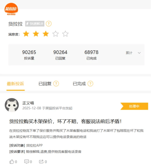 在黑猫投诉平台上,截至2025年12月8日,货拉拉投诉量有90265条,已完成68978条,近30天投诉量有1523条,已完成266条。除了一般用的投诉外,也有不少司机的投诉。