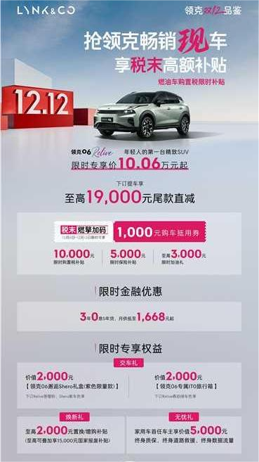 随着年底临近,很多人开始盘点自己的购物清单,“买车”成为讨论的热门话题。一年辛苦工作后,选择一辆既能满足日常通勤,又能支持周末出行的车辆,既是对自己的犒赏,也是年底福利政策叠加的最佳契机。对于追求实用与格调的人来说, 领克06(参数|询价) Relive正好符合这一需求。12月购车不仅享受购置税和保险补贴,专享价格10.06万元起,还可叠加加油礼,让购车体验更加轻松愉快。