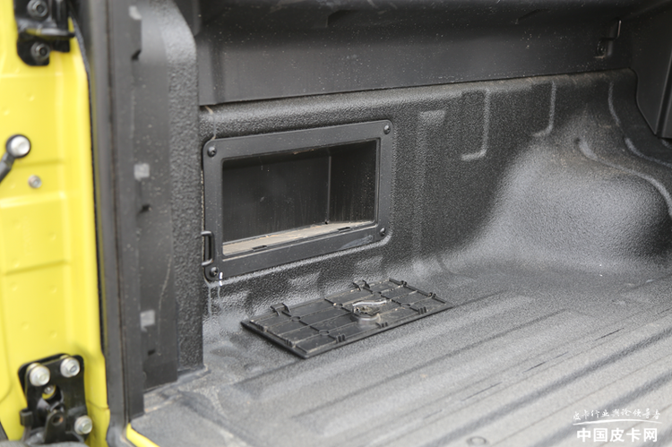 货箱内部也别有洞天,除了右侧常规的外放电插座外,左侧还有一个比较小的储物格,能放随车工具,或者绳索之类的物品。