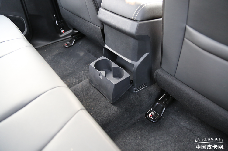 在中央扶手箱后部,同样设计了一个可翻折的水杯座。平时后排没有人的时候可以收起来,不影响放置其他物品。后排坐人的时候打开,乘客的水杯、手机钱包等等物品均可以放在这里。