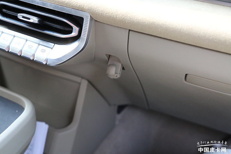其次就是中控台底部,与大通星际X类似,都是使用了悬浮式副仪表板的设计,前部和底部都有巨大的空间。在副驾驶部分,还有一个很小的可翻折的挂钩,可以挂一些比较轻的物品。