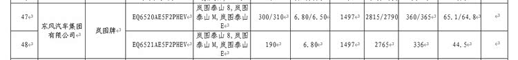 具体来看,本次申报的两款电池分别为65和44.5千瓦时,前者无论是电池的容量,还是360千克起步的电池重量,都和岚图泰山完全相同,再加上之前新车公示中显示的150马力1.5T发动机517马力前后双电机组成电控四驱系统,也都和泰山完全相同,因此可以说基本复制了泰山的设计,那这样一来就还是之前文章中描述过的那个问题,可能会有一些重叠,不知道官方有着怎样的思路,最终纯电续航里程WLTC工况300公里,由于车身毕竟要更小一些,自重略轻,比泰山高了10公里,说实话差异可以忽略不计,百公里油耗可低至6.5升,要比泰山低了0.4升,也是更加出色的表现,或将有技术方面的优化。
