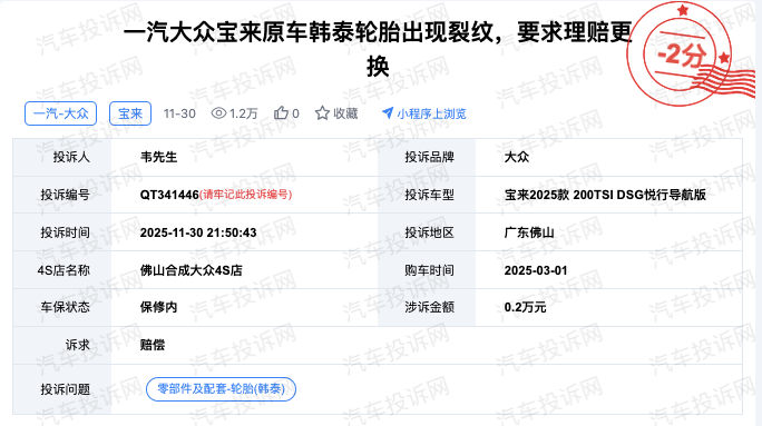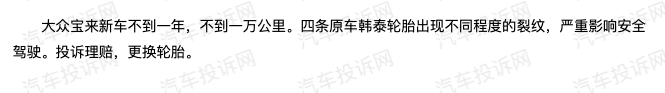 近期我们收到一位来自广东佛山的车主投诉, 宝来(参数|询价)悦行导航版原厂轮胎存在异常裂纹。该车于2025年3月1日购入,行驶里程不足1万公里,四条原车韩泰轮胎均出现不同程度裂纹的现象,该情况引发了对轮胎安全性能的关注。
