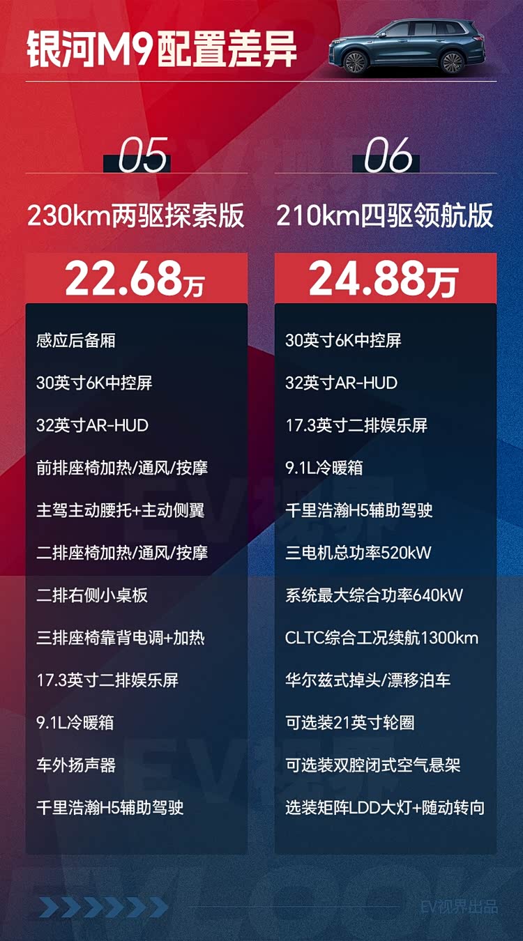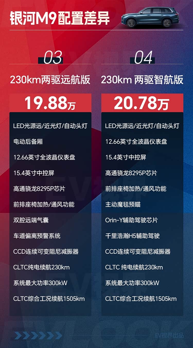顶配版本定价24.88万,相比探索版贵出2.2万,核心升级点在于新增后轴双电机组成四驱系统,动力性能大幅提升,同时解锁了价值2万元的“魔毯星驰套装”选装资格,包含双腔闭式空气悬架、21英寸品牌轮胎、矩阵ADB大灯、AFS随动转向及流水转向灯等高端配置。若预算充足,追求极致动力与豪华驾乘体验,顶配版本能全面满足需求,是追求旗舰体验用户的首选。写在最后银河M9的热销并非偶然,它没有堆砌华而不实的配置,也没有在核心维度偏科,而是精准捕捉家庭用户的核心诉求,设计实用美观、空间灵活舒适、动力省油强劲、智能安全省心,6个细分版本更实现预算与场景的精准匹配。18.38万元起售价,让“人民的M9”从口号落地为现实。此前20万级六座SUV市场,家庭用户往往面临“空间小、油耗高、配置低”的妥协困境,而银河M9的出现,实现“面面俱到”的产品体验。它用均衡的产品力证明,家庭SUV无需妥协,只要真正读懂用户需求,就能打造出“人民满意”的车型。银河M9并非为竞争而生,而是为家庭用户而来。对多孩家庭而言,它不仅是交通工具,更是全家出行的温馨载体,这正是20万级大六座SUV应有的模样。