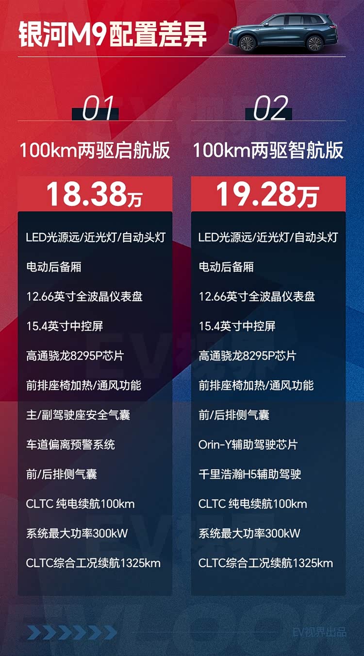 安全防护全面升级,高强度星甲笼式车身扭转刚度达32500Nm/deg,超越多数豪华车型,碰撞时变形量小,保障乘员生存空间。9安全气囊(含同级独有双腔远端气囊)构建全维防护,重点关注后排老人与孩子的安全;40余项L2级基础安全功能,从主动预防(车道偏离预警)到被动防护(安全气囊),形成全场景安全体系。银河M9的智能安全配置,始终围绕“带娃出行”“新手停车”“长途驾驶”等实际场景,让每一项功能都能真正解决问题,而非停留在参数层面。6个细分版本,精准匹配家庭需求银河M9指导价18.38万-24.88万元,覆盖“基础刚需”到“全面尊享”的全场景需求,6个版本避免功能冗余或核心缺失,精准匹配不同家庭预算与用车场景,18.38万的100km两驱启航版,是五口之家入门首选,覆盖家庭“生存级配置”,星汉涟漪设计(380颗LED大灯+436颗LED尾灯)、5.2㎡车内空间(88.3%得房率)、雷神EM-P电混系统、主驾自适应腰托、9安全气囊+40项L2基础安全功能。适合日常通勤、市区短途出行,对智能和舒适配置需求较低,追求“能装、省油、安全”的家庭。它的核心优势就是17万级六座SUV做到“不删减安全配置”。
