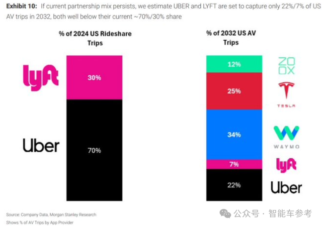 据摩根士丹利研究报告显示,2024年,美国出租车市场几乎被Uber和Lyft瓜分,二者市占率分别为70%和30%。