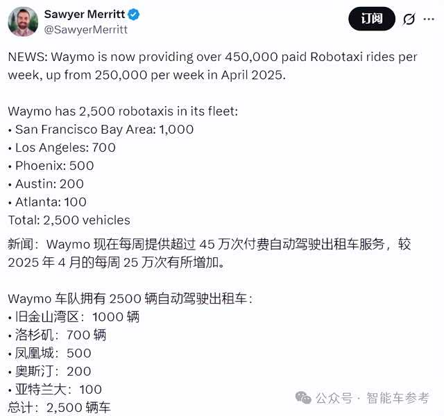 据电动汽车分析师(同时也是特斯拉粉丝和Model Y车主)——Sawyer Merritt在社交平台X上发帖透露:Waymo目前已在全美范围内部署了2500辆Robotaxi。