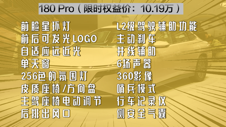 那就继续看下180Pro版,价格上比入门款贵了1万。配置方面,首先前脸多了星环灯和可发光的LOGO,走在路上辨识度更高,也更有电车的味道。车顶多了个小天窗,车内多了256色的氛围灯,座椅和方向盘均换成皮质的,还有了主驾座椅的电动调节,后排出风口,以及一整套完整的L2级驾驶辅助功能。像是360影像、哨兵模式,行车记录仪等,这种很提升幸福感的东西,也全都配备了。此外,四扬声器升级为八扬声器,四气囊升级为六气囊。