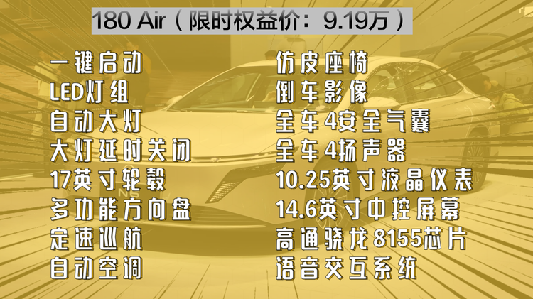 好,下面我们具体配置具体分析。看看哪个版本值得优先考虑。先看一下入门的180 Air版,这个版本的配置相对基础,相当于日产轩逸中配的水平。有一键启动,LED灯组,大灯还有自动开关和延时关闭等功能,轮毂是基础的17英寸。然后车内有多功能方向盘,定速巡航,自动空调,仿皮座椅,倒车影像,全车4安全气囊,4扬声器等功能配置。液晶仪表和中控屏幕的尺寸分别为10.25英寸和14.6英寸,内置高通骁龙8155芯片,各种语音交互系统,也还算齐全。