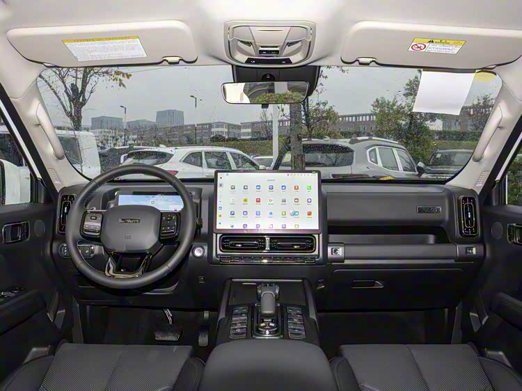 进入车内,其中控台布局依然保持平直线条,局部采用镀铬装饰点缀。方向盘为三辐式设计,中控屏幕尺寸为14.6英寸,换挡杆造型较为独特。在功能配置上,座椅提供了加热与通风功能,并搭载了有助于狭窄路段转向的坦克掉头系统。整体来看,车内兼顾了日常使用的舒适性与户外驾驶所需的操作便利性。