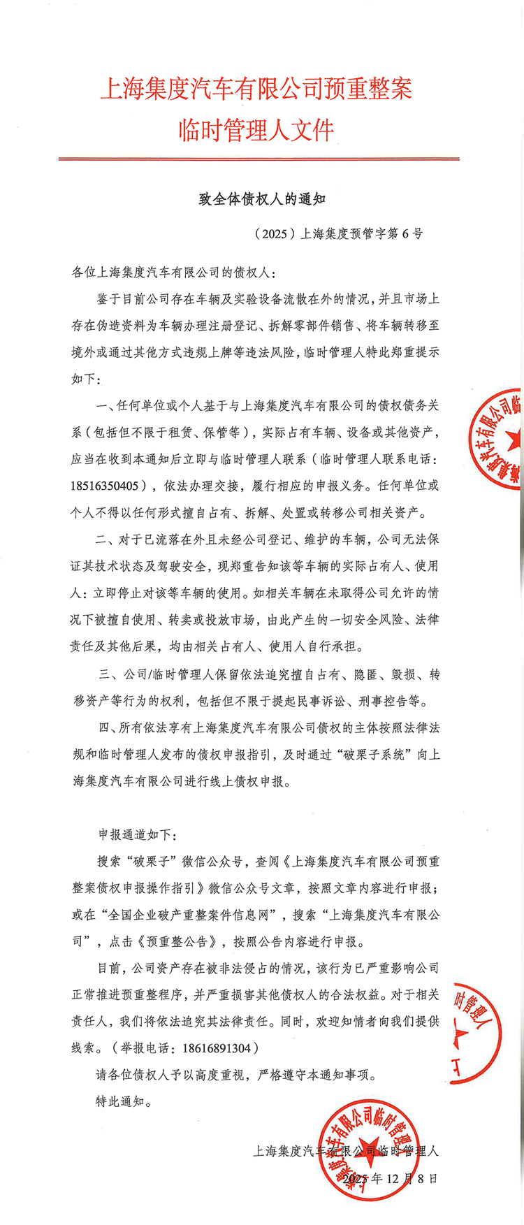 根据通知,任何单位或个人如基于与上海集度汽车有限公司之间的债权债务关系——包括但不限于租赁、保管等事由——实际占有该公司所属的车辆、设备或其他资产,应在收到本通知后立即与临时管理人取得联系。相关人员须依法办理资产交接,并履行对应的债权申报义务。公司强调,任何单位或个人均不得以任何形式擅自占有、拆解、处置或转移上述资产。