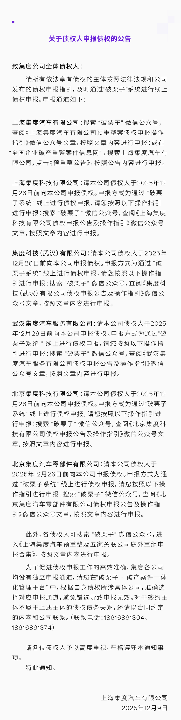 此外,所有依法享有上海集度汽车有限公司债权的权利人,应依照法律法规及临时管理人发布的债权申报指引,及时通过“破栗子系统”进行线上债权申报。该举措旨在规范债权申报流程,保障后续清偿工作的有序推进。
